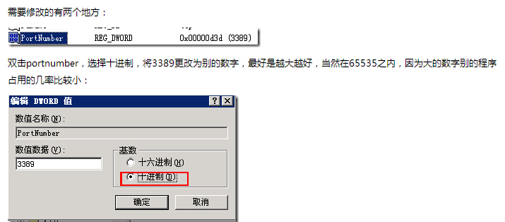 3、更改3389遠程登錄端口 Windows默認的遠程登錄端口是3389,有的時候為了安全考慮,需要更改遠程端口。點擊 開始-運行-輸入 regedit 打開注冊表編輯器,由于注冊表上有很多信息,最簡單的方法尋找需要修改端口的地方,鍵盤ctrl+F,彈出搜索框,輸入Portnumber進行查找,可能會搜到幾處選項,注意查找值為3389的名稱。![]() 需要修改的地方有兩個-雙擊portnumber,選擇十進制,將3389更改為別的數字,最好是越大越好,當然在65535之內,因為大的數字別的程序占用的幾率比較小。