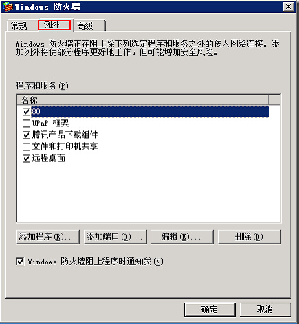 4、防火墻安全配置 修改完成后,一定要查看本地的防火墻用沒有打開,如果打開,需要在防火墻中將修改后的端口添加到例外。右鍵網上鄰居-選擇屬性-網絡連接-右鍵本地連接-屬性-高級-設置,打開windows防火墻,選擇例外選項:![]()