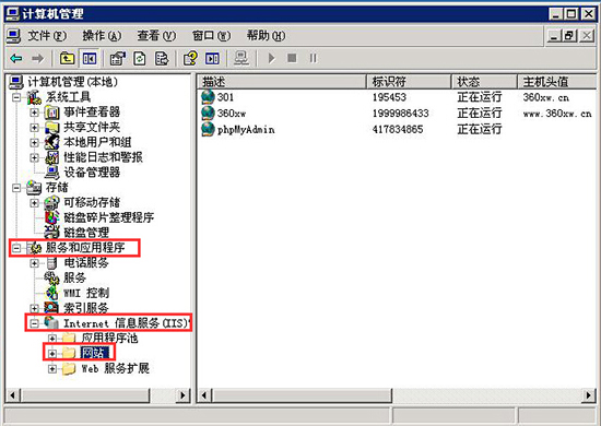 2、在管理窗口依次打開服務和應用程序”--“Internet信息服務(IIS)”--“網站”。