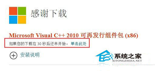 6、然后會自動彈出下載窗口,若沒有彈出,我們可以點擊“如果您的下載在30秒后還未開始,單擊此處”即可下載,下載完成后,關閉所有程序和網頁,開始安裝,安裝好后重啟計算機即可完美解決。