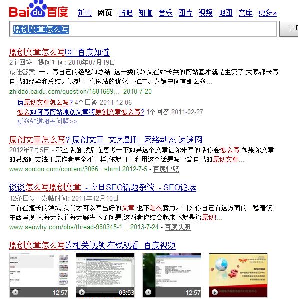 下面給大家舉例說(shuō)明一下吧,假若你寫的一篇文章是關(guān)于原創(chuàng)文章怎么寫的話,那么你寫的文章被收錄幾率到底高還是低?首先,我們通過(guò)百度搜索引擎搜索:原創(chuàng)文章怎么寫
