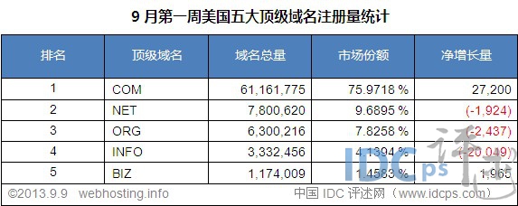在9月第一周(9月3日-9月9日)期間,五個頂級域名均增勢良好。其中,.COM域名新增33,891個;.NET域名新增3,891個;.ORG新增246個;.INFO新增1,059個;.BIZ新增437個。