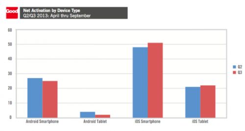 報(bào)告顯示在設(shè)備激活方面來看蘋果在第三季度的市場占比達(dá)到了72%,相比較第二季度的69%出現(xiàn)了增長。而Android設(shè)備則從第二季度的30%下降到27%,第一季度設(shè)備的占比為25%,出現(xiàn)增長的主要原因是三星推出了新產(chǎn)品。