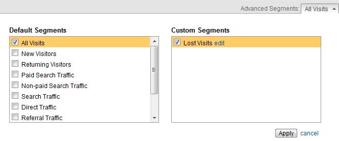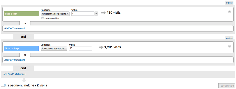 我們可以用戶細分的方法把那些瀏覽頁面數較多,但頁面平均停留時間較短的用戶瀏覽看作是迷失用戶,具體的數值可以根據網站自身的特點進行定義,比如我定義我的博客中瀏覽頁面數大于等于4,而頁面平均停留時間小于等于15秒的Visits為迷失用戶的瀏覽行為,我們可以借助Google Analytics中的高級群組(Advanced Segment)來區分出這類用戶,關于如何使用Google Analytics的高級群組功能,可以參考藍鯨的文章——Google Analytics功能篇—高級群組,如下圖: