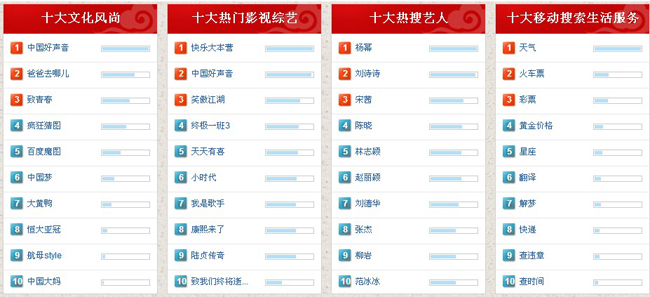 百度2013年搜索風云榜包括8個主榜單和16個特色榜單,其中主榜單囊括2013十大搜索熱詞、十大上升最快事件、十大話題人物、十大網絡流行語、十大文化風尚、十大熱門影視綜藝、十大熱搜藝人、十大移動搜索生活服務。