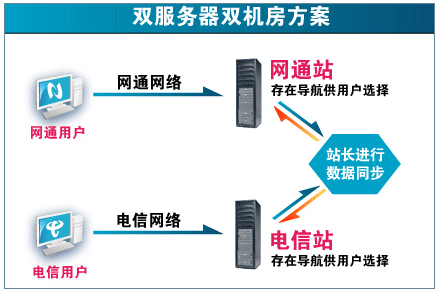 實際是一個網(wǎng)站分別租用兩個服務器,分別放在電信機房和網(wǎng)通機房, 然后讓電信用戶訪問電信站點,網(wǎng)通用戶訪問網(wǎng)通站點。這樣讓用戶獲得最好的網(wǎng)絡速度。