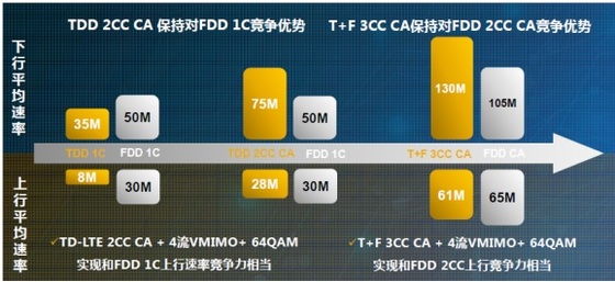 TDD/FDD融合組網(wǎng)對于中國移動有著多重的重要性:其一,只有TDD/FDD融合組網(wǎng)后結(jié)合載波聚合功能實現(xiàn)130M下行/60M上行才能確保在速率上時時都能領先FDD一步(如圖所示);其二,只有TDD/FDD融合組網(wǎng)才能幫助中國移動擺脫其國際合作伙伴的FDD LTE用戶漫游到中國移動網(wǎng)絡上無4G可用的尷尬境地;其三,隨著移動寬帶步入物聯(lián)網(wǎng)時代,當寬帶由人的連接發(fā)展到“人+物”的連接,TDD(時分雙工)技術適應非對稱業(yè)務的優(yōu)勢會由于上行受限而變成劣勢,所以TDD/FDD融合組網(wǎng)是必然趨勢。