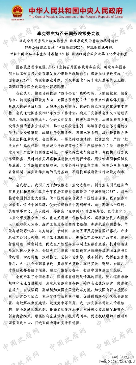 國(guó)務(wù)院總理李克強(qiáng)3月25日主持召開國(guó)務(wù)院常務(wù)會(huì)議,確定今年國(guó)務(wù)院立法工作重點(diǎn),讓改革發(fā)展沿著法治軌道前行;部署加快推進(jìn)實(shí)施“中國(guó)制造2025”,實(shí)現(xiàn)制造業(yè)升級(jí);聽取中國(guó)北車南車重組進(jìn)展情況匯報(bào),強(qiáng)調(diào)以國(guó)資國(guó)企改革優(yōu)化資源配置。