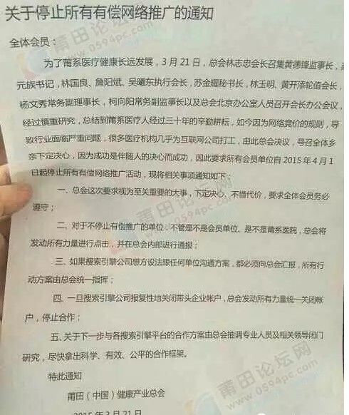 3月25日微博賬號@北冥乘海生爆料,莆田(中國)健康產業總會向所有莆田系醫療機構發放通知,要求協會中所有機構停止在互聯網上的有償網絡推廣。這份由“中國健康總會”發出的內部會議通知顯示:“經過慎重研究,莆田醫療人經過三十年的辛勤耕耘,如今因為網絡競價規則,導致產業面臨嚴重問題,很多醫療機構幾乎為互聯網公司打工,因此總會決定,號召全體鄉親停止有償網絡推廣活動。”
