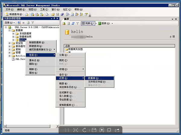 2、右鍵點(diǎn)擊需還原的數(shù)據(jù)庫(kù),選擇”任務(wù)“→”還原“→”數(shù)據(jù)庫(kù)“。