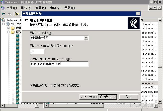 4、這里是比較關鍵的一步,IP地址一般設置“全部未分配”,這樣有個好處:萬一主機變動了IP,你不需要去IIS里面設置,只需要修改下域名解析就可以了。當然,如果你有多個IP,也可以為不同的網站指定不同的IP。端口一般為80,Web服務標準端口。主機頭那里寫你網站的域名,繼續,下一步