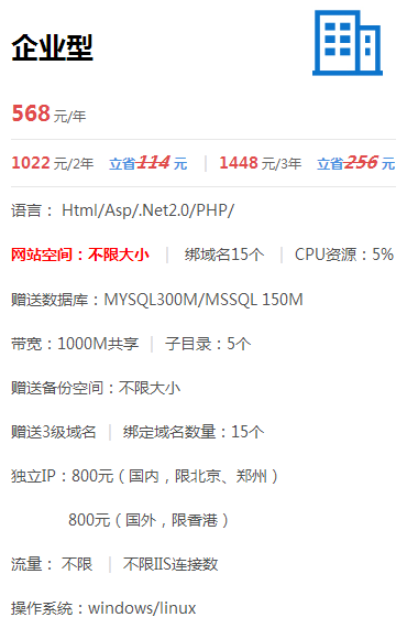 虛擬主機可分為國內虛擬主機、免備案虛擬主機,其中免備案虛擬主機以簡單、方便、快捷更贏得了客戶的喜愛。免備案虛擬主機開通即可使用,不限制IIS流量,讓您的網站更暢通。采用DELL高配服務器,安全穩定。7*24小時全天候客戶服務,更放心。其價格更加優惠,具體如下圖所示: