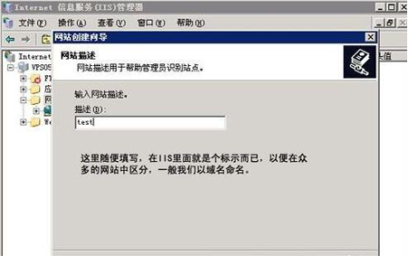 3、輸入網(wǎng)站描述,一般我們寫網(wǎng)站域名,它是網(wǎng)站在IIS里面的標識(名稱)。
