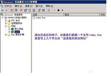 7、添加完成后,我們在d:\wwwroot 創(chuàng)建一個文件index.htm 用記事本打開,寫入測試文字。