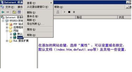 8、添加完成后,可以看到“test” 的網(wǎng)站,如圖:右鍵“屬性”可以綁定域名,設置默認文檔,404錯誤頁,MIME類型等等....