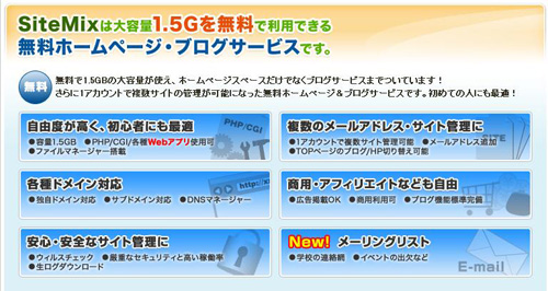 SiteMix是一家日本免費空間服務網站,1.5G存儲空間,支持PHP,提供免費二級域名1個或綁定1個你自己的域名(僅支持頂級域名,二級域名不可以),FTP、Web方式上傳管理文件。