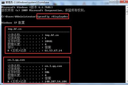 2、在新彈出的命令提示符窗口中輸入“ipconfig /displaydns”,我們便可查看到系統之前使用過的DNS地址,如下圖所示: