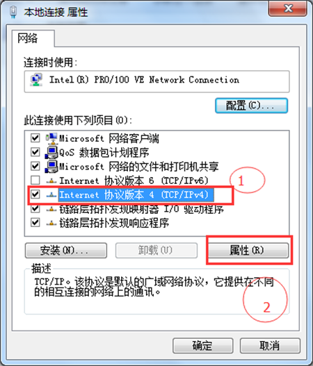 3、在網絡連接屬性窗口中,找到 Internet協議版本4(TCP/IPv4),然后點擊“屬性”,如下圖所示
