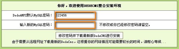 在輸入新的MySQL密碼框中輸入你需要設置的MySQL密碼點擊“修改密碼并下載最新版DedeCMS運行安裝”執行修改MySQL密碼下載最新的DedeCMS安裝程序。等待程序下載,會花幾分鐘的時間 如圖五: