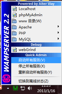 2、WampServer的官方網站沒有中文,但是程序支持中文。啟動安裝程序后,它會提示你請先卸載舊版,不支持覆蓋式的升級,然后一路NEXT能安裝成功。它在任 務 托盤里有個圖標,如果服務啟動異常,它是紅色的;如果部分異常,它變成黃色;如果是一切正常,那么它變成了白色。這些不同的顏色警示,你很容易判斷 當前你的localhost能不能打開。它還能切換在線和離線狀態,選項中的文語言項中也有簡體中文可選,很不錯。