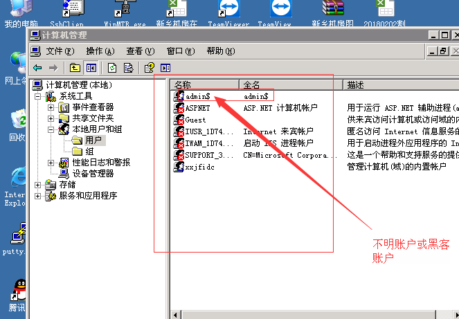 5.打開后,可以看到右邊窗口會顯示很多用戶列表,查看 是否有帶$符號的用戶,確定不是自己用賬戶 ,那肯定就是黑客賬戶 。