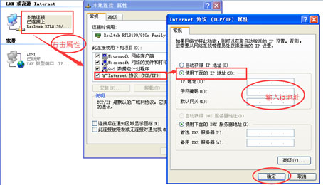 在“控制面板→網絡連接→本地連接→右鍵屬性→Internet協議(TCP/IP)→屬性→使用下面的IP地址”,