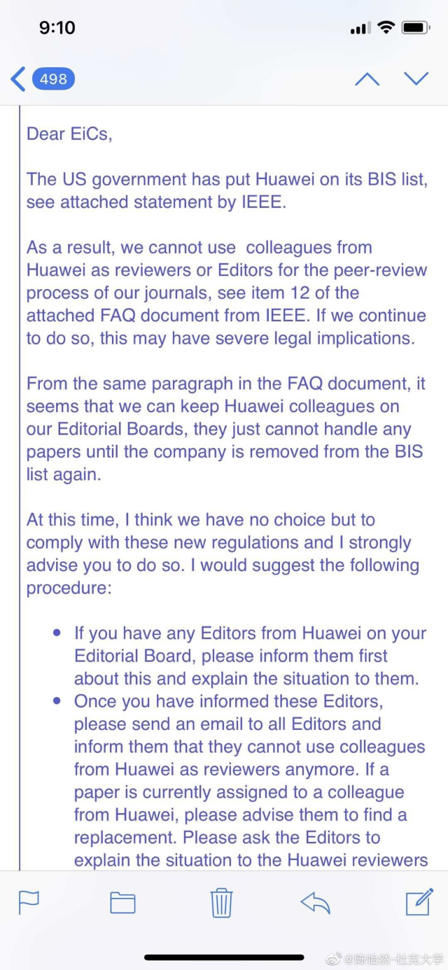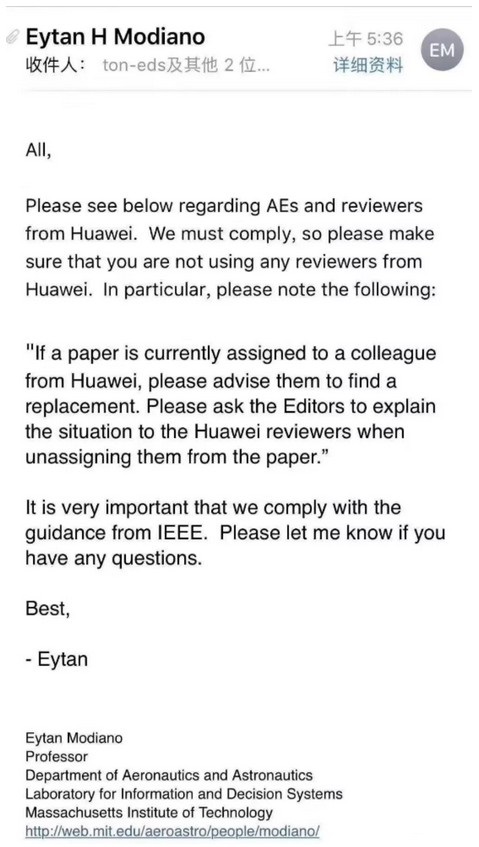 我們別無選擇,只能遵守這些新規(guī)定,強(qiáng)烈建議您執(zhí)行以下程序:如果您的編輯委員會(huì)中有華為的編輯,請(qǐng)首先通知他們,并向他們解釋情況。一旦您通知了這些編輯,請(qǐng)向所有編輯發(fā)送電子郵件,并告知他們不能再使用華為員工作為審稿人。如果目前有論文被分配給華為員工,請(qǐng)建議他們尋找替代者。請(qǐng)編輯向華為審核人員解釋情況。”