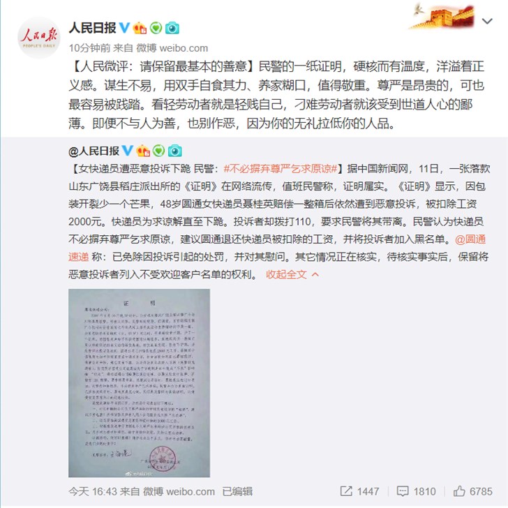 《證明》顯示,因包裝開裂少一個芒果,48歲圓通女快遞員聶桂英賠償一整箱后依然遭到惡意投訴,被扣除工資2000元。快遞員遭投訴下跪也得不到原諒。投訴者卻撥打110,要求民警將其帶離。民警認(rèn)為快遞員不必摒棄尊嚴(yán)乞求原諒,建議圓通退還快遞員被扣除的工資,并將投訴者加入黑名單。事發(fā)后,圓通官方發(fā)表聲明稱業(yè)務(wù)員所在網(wǎng)點已免除因投訴引起的處罰,并對其進(jìn)行慰問。