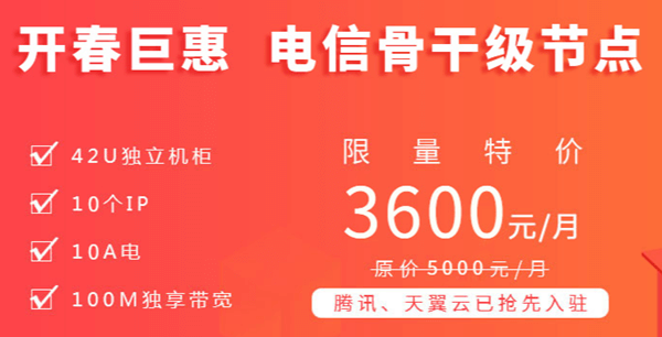 億恩科技特推出IDC電信機(jī)柜特價(jià)優(yōu)惠活動(dòng),42U標(biāo)準(zhǔn)機(jī)柜/10個(gè)ip/10A電/100M帶寬,特價(jià)低至3600元/月。