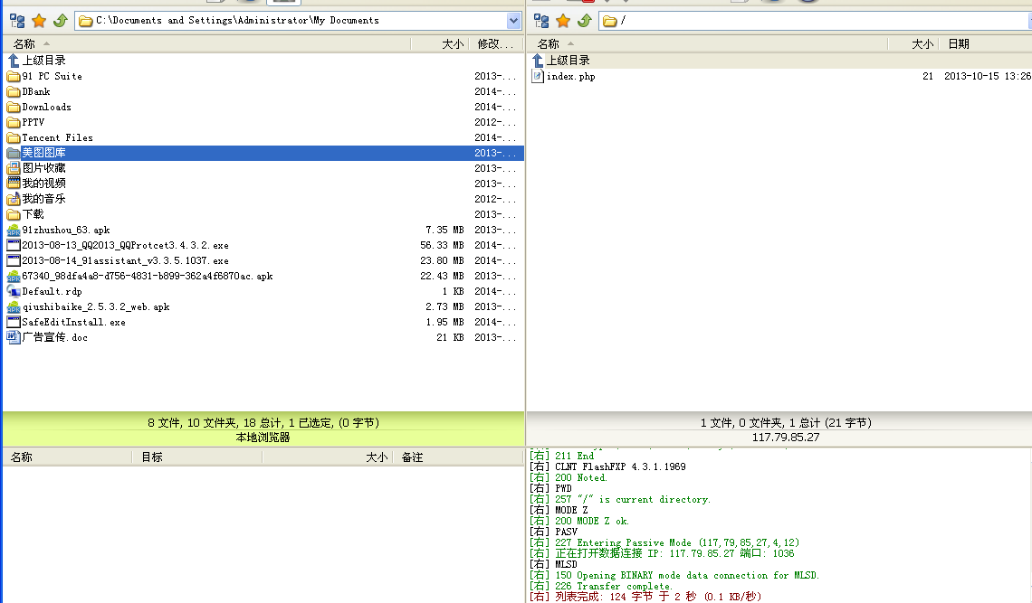 到此我們的ftp安裝測試完畢。左邊是我們的電腦,右邊是服務器,可以相互拖動,也可以右鍵點擊我們要下載或者上傳的文件點傳輸。