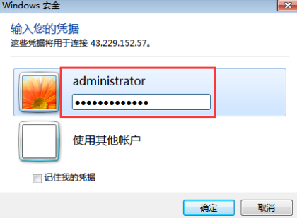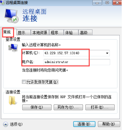 2. 輸入計算機IP和端口,用戶名。注意:IP和端口之間的冒號是必須要在英文狀態(tài)下輸入的,否則就登錄不上云服務器。用戶名一般用默認的管理員的身份:administrator ,如果需要創(chuàng)建新的用戶名,進入服務器后可以直接添加。建議大家在開通云服務器之后,要及時修改登錄密碼。